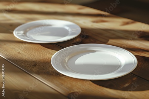 Simple white plates on a rustic wooden table reflecting sunlight in a cozy setting