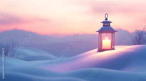Simple winterthemed composition with snowcovered hills and a warm glowing lantern in the foreground on a soft gray gradient background