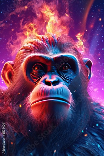 Singe dans l'univers, eau, feu, néon, or, argent, cuivre, marbre, violet, néon