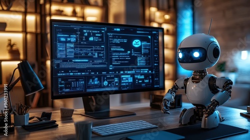 Single AI-driven virtual assistant on a desktop screen, minimal home office scene with large blank space surrounding, copy space for stock photo with minimal concept, No logo, No Trademark, No text