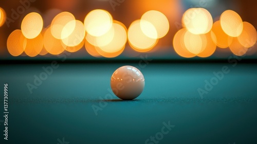 pool, billiard, table, game, sport, billiard, snooker, white, ball, teal, green, light, bokeh, light, night, evening, warm, orange, yellow, blur, sharpened, dark, interior, club, bar, eatery, party, entertainment, fun, relaxation, leisure, design, photo, image, still, life, object, isolated, background, illumination, ambience, atmosphere, sporting, arcade, activity, social