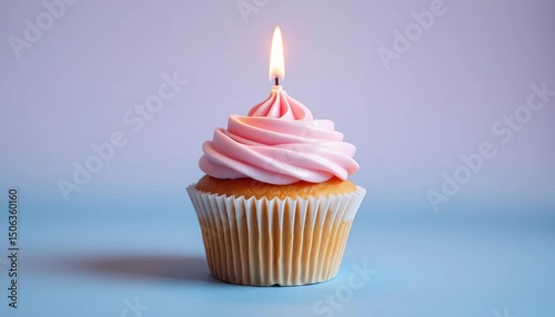 Single pastel pink cupcake with lit candle, pastel blue background, cute, strawberry
