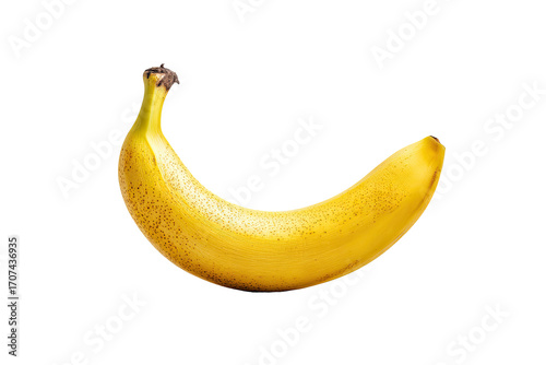 banana, fruit, yellow, ripe, food, healthy, potassium, vitamin, organic, fresh, delicious, curved, tropical, plant, closeup, isolated, natural, single, whole, edible, alimentary, smooth, spot, brown, stem, top, bottom, xanthous, gold, produce, diet, nutrient, vegan, vegetarian, snack, foodstuff, sweet, tasty, juicy