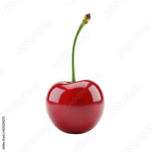 Single ripe red cherry with stem isolated on transparent background, a sweet and juicy summer fruit