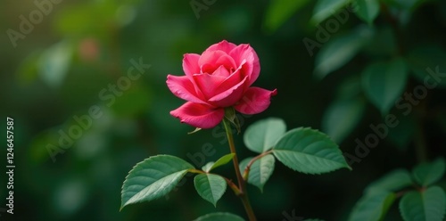 Single rose with large, velvety leaves on a wooden branch, verdant, leaves