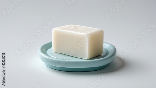Single soap piece on a soap dish with a neutral background
