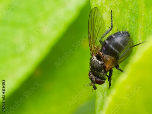 Siphona Ganiculata Fly sitting on a lush green leaf.