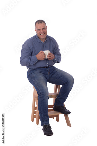 40s, egyptian, middle-aged, thirsty, adult, arab, arabian, attractive, background, blue, break, chair, classic, hot drink, confident, cup, cute, egypt, elegant, fashion, full-length, grey, hair, hand, photogenic, happy, hold, isolated, jean, leg, man, mature, mid-adult, old, 1, pant, people, posing, positivity, pure, relaxing, shirt, shoe, sitting, smile, stair, tea, white, wood
