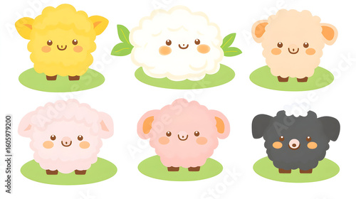 Six cartoon lambs of varying colors on green patches