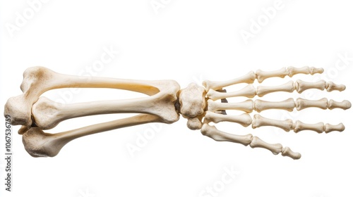 Skeletal hand and wrist, isolated on white, detailed bone structure, suitable for medical and educational use