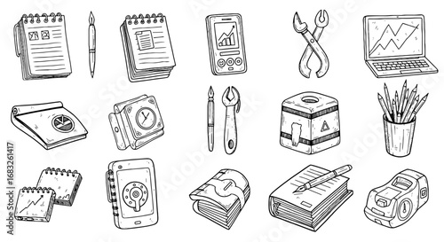 vignetting, doodle, icon, office, supply, hand, drawn, set, pen, tool, notebook, smartphone, stationery, laptop, paper, tape, box, element, vector, illustration, drawing, clip art, art, design, graphic, digital, scribble, document, equipment, instrument, collection, creative, style, workspace, business, study, desktop, work, tool, supply