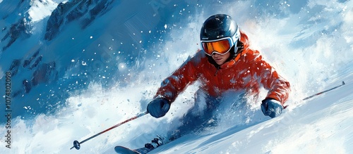 skiing, skier, snow, mountain, winter, sport, athlete, ski, slope, downhill, speed, action, adventure, powder, fresh, cold, alpine, snowboard, range, helmet, goggles, glove, fast, active, glacé, white, blue, orange, red, illustration, digital, art, painting, artwork, graphic, activewear, equipment, pole, ski, wintery