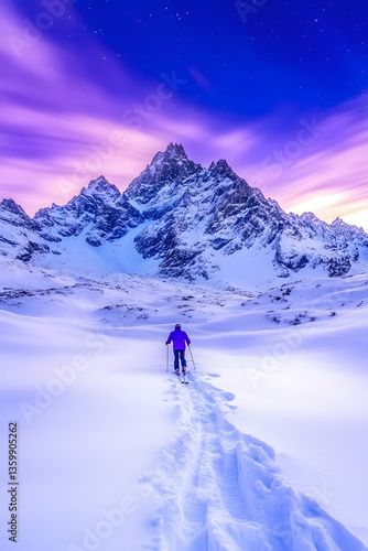 skier, mountain, snow, twilight, winter, landscape, trekking, alps, ski, nature, purple, sky, cold, adventure, sport, travel, scenic, view, beautiful, explore, freedom, peace, serenity, climb, challenge, journey, destination, wild, powerful, breathtaking, amazing, fantastic, magnificent, stunning, picturesque, spectacular, unforgettable, exhilarating, inspiring, motivational, winter sports, snowscape, peak