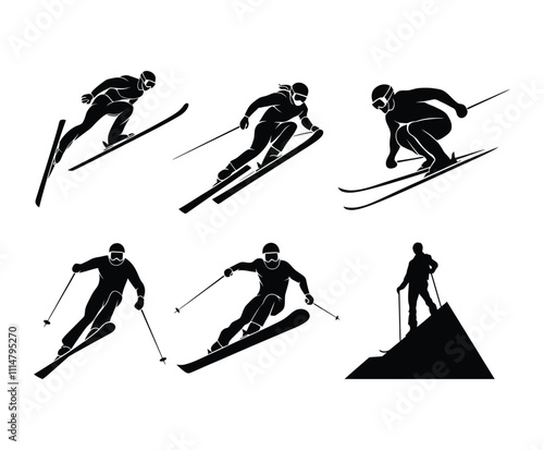 sport, vector, skiing, illustration, ski, winter, silhouette, people, skier, man, black, snow, set, athlete, extreme, jump, speed, collection, downhill, isolated, activity, competition, fast, outline, teenage