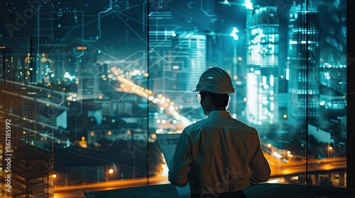 engineer, construction, tower block, building, structural, plan, professional, attire, industrial, equipment, cinematic, lighting, futuristic, aesthetic, modern, city landscape, urban, architecture, skyscraper, blueprint, planning, design, oversight, exam, detail, technology, infrastructure, development, progress, transformation, skyline, night time, illumination, industry, innovation, civil, skilled, sharpened, wear, background, concept, scene, digital, render, creative, dynamic, perspective, panoramic