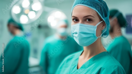 Skilled female surgeon in surgical scrubs and mask in operating room with medical staff focused on patient procedures and hospital environment