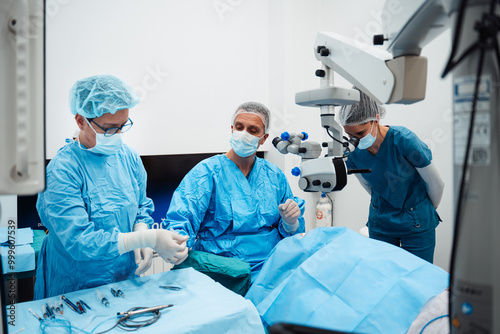 Skilled surgeon and his medical team performs precise eye surgery on an elderly patient, restoring vision with latest medical technology and cutting-edge techniques. Modern eye surgery concept.