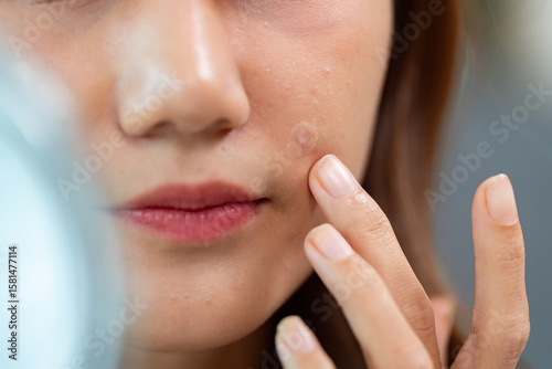 Skin Care Focus. Woman examining blemish on her face in the mirror.