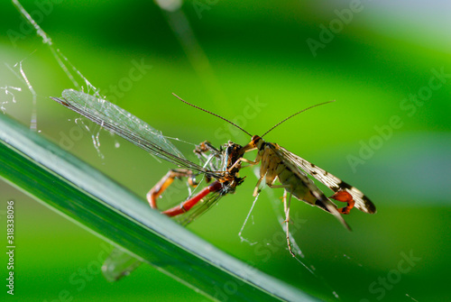 Skorpionsfliege bei Mundraub aus einem Spinnennetz, Männliche Skorpionsfliege frisst opfer aus Spinnennetz, Mundräuber Skorpionsfliege frisst Spinnenbeute
