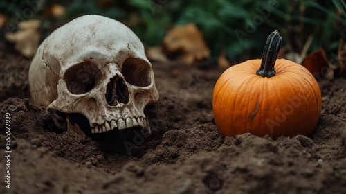 Skull and Pumpkin in Soil with Autumn Leaves for Halloween Celebration and Spooky Vibe