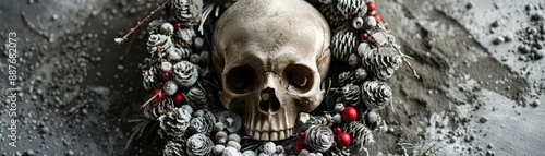 halloween, skull, pine, cone, frosted, red, berry, dark, background, human, eerie, decoration, winter, holiday, gothic, skittish, contrast, texture, nature, grisly, chaplet, seasonal, artistic, design, creepy, mysterious, haunting, unique, arrangement, death, festive, cold, chilling, dramatic, ominous, rustic, vintage, decor, horror, symbolism, photo, still life