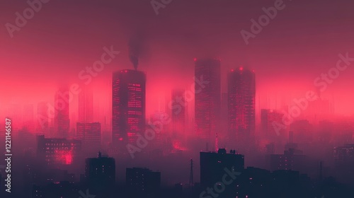 Skyline engulfed in reddish smog at twilight, surreal tones reflecting severe air pollution, [urban haze], [air quality challenges].