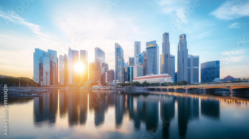 city landscape, skyline, sunrise, river, modern architecture, city landscape, skyscraper, city view, waterfront, serene, morning light, metropolitan