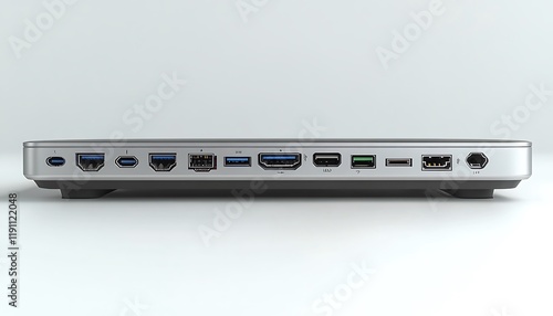 Sleek aluminum laptop docking station with various ports and outlets white background
