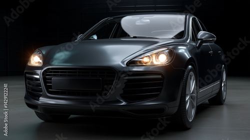 sleek black luxury car with illuminated headlights, showcasing its modern design and elegance in dimly lit environment, evokes sense of sophistication and power