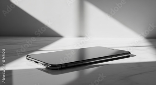 smartphone, mobile, phone, technology, device, electronic, communication, digital, modern, sleek, black, white, greyscale, monochrome, shadow, light, dramatic, contrast, surface, marble, texture, pattern, clean, minimalist, simple, elegant, design, object, contraption, portable, hand-held, screen, display, side, buttons, speaker, port, innovation, connectivity, wireless, datum, cyberspace, app, business, lifestyle, personal, everyday, closeup, detail