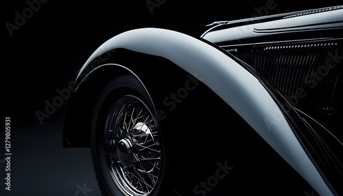 car, vehicle, automobile, black, vintage, classic, tire, wheel, spoke, rim, glossy, shiny, dark, shadow, detail, metal, chrome, curve, fender, elegance, luxury, transport, automotive, design, style, antique, machine, technology, retro, transportation, mode, grill, radiator, bonnet, hood, road, drive, speed, old, motor, industry, artwork, studio, artistic, profile, side, front