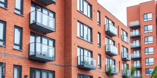Sleek brick apartment building with modern balconies and large windows, construction, sunlight
