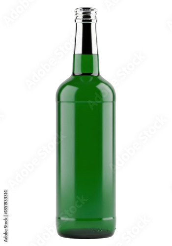 Sleek, cylindrical, matte deep emerald green glass bottle, sealed with a polished chrome silver cap, isolated on a transparent high-key background with copy space. Concept for beverage advertising