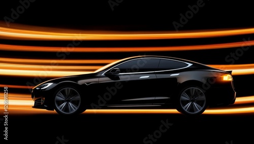 Sleek electric car with neon light trails outlining its silhouette