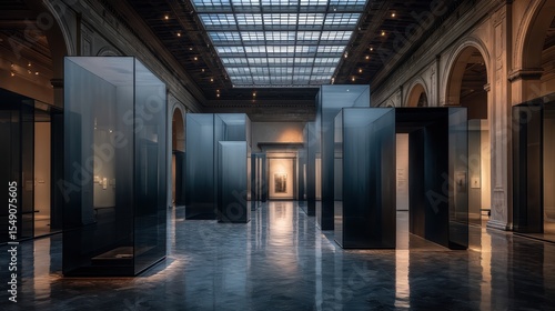 Sleek glass directional panel reading Gallery → on a softly blurred museum foyer background
