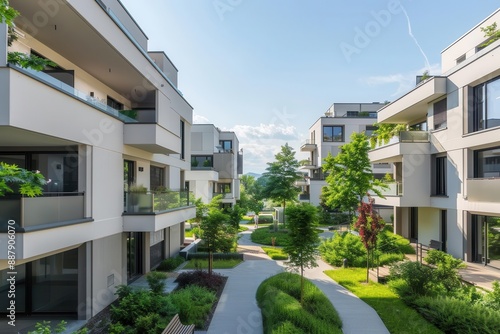 sleek minimalist residential complex with sustainable features geometric shapes surrounded by green spaces and walking paths