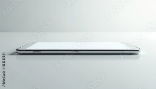 Sleek minimalist smartphone with blank screen rests on white surface. Modern mobile device represents communication technology, app development. Perfect for tech ads, presentations, product mockups.