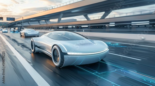Sleek modern car seamlessly merging with another on futuristic highway, symbolizing technological integration and innovation in automotive design and transportation advancements.