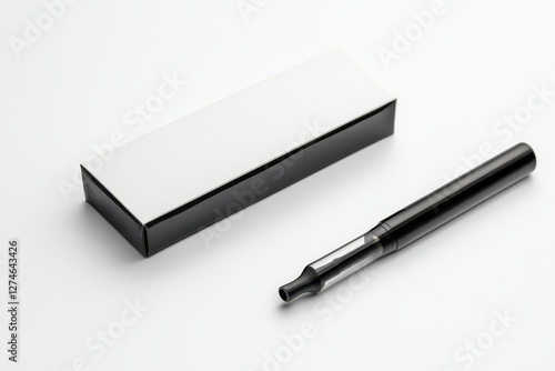 Sleek, modern vape pen resting beside its stylish black and white packaging on a bright surface isolated on transparent background