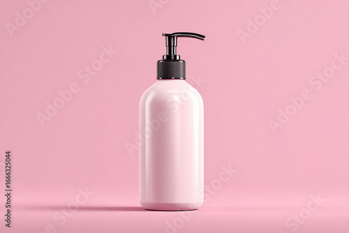 Sleek pink lotion pump bottle stands against soft pink background, showcasing its modern design and elegant simplicity. This product is perfect for skincare enthusiasts