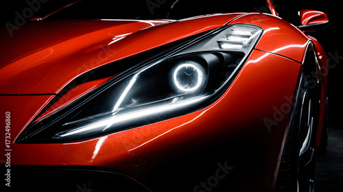Sleek red sports car with striking headlights showcasing modern automotive design features