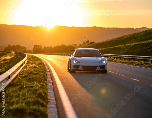 Sleek sports car drives on a highway during a vibrant sunset