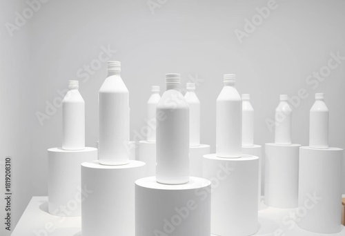 Sleek white plastic bottles on simple pedestals, minimalist display, plastic containers, modern
