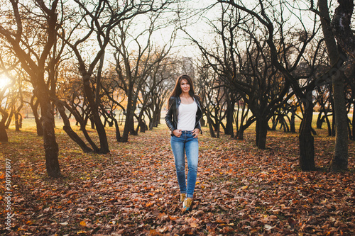 Slender graceful attractive girl in the park among the trees - cheerful successful self-sufficient woman