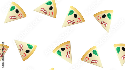 slice of pizza on thin crust, white background, vector illustration, pattern. pizza stuffed with meat and vegetables, with herbs. pattern, kitchen decoration, stylish wallpaper