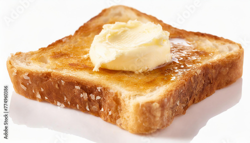 Slice of toasted bread with butter spread aside. Tasty breakfast. Delicious food. Isolated on white