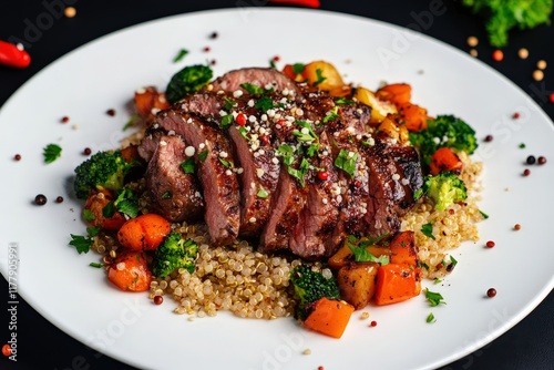 Sliced grilled beef with quinoa and roasted vegetables on a white plate