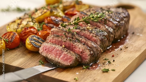 Sliced grilled steak with a knife and roasted vegetables on wooden board showcasing delicious gourmet meal presentation.