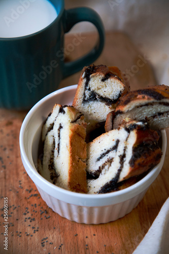 black, blue, breakfast, bun, carbohydrate, closeup, crumb, dairy, delicious, flax, food, fresh, gold, epicure, homemade, kitchen, milk, morning, mug, natural, organic, pastry, poppy seed, seed, shiny, simple, slice, sweet, tablecloth, warm, wheat, white, white cup