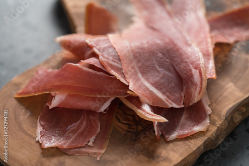 sliced prosciutto on olive wood board